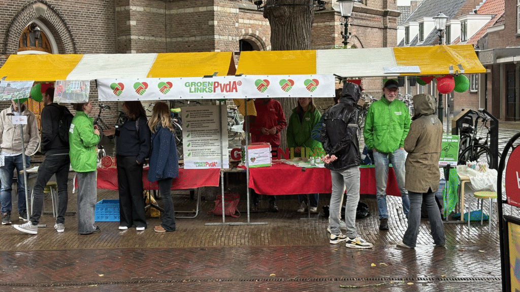Op 13 september was er de jaarlijkse vrijwilligersmarkt in het centrum van ons dorp. Ik ben er de hele dag geweest, d.w.z. van 10 uur ‘s-morgens tot 3 uur ‘s-middags. Ik had gehoopt op een zonnige nazomerdag, dat hoort nu eenmaal bij de vrijwilligersmarkt vind ik, maar dat zat er niet in. Het was bewolkt, er stond een stevige en frisse wind, en rond het middaguur werden we overvallen door een flinke plensbui. Op de weerapp was te zien dat rond 3 uur opnieuw regen op het programma stond, en zo kwamen we in de verleiding om de bui voor te zijn, de kraam voortijdig te ontruimen en op huis aan te gaan. Mijn collega-vrijwilligers en ik hadden een kraam ingericht van de lokale afdelingen van GroenLinks-PvdA. We zijn nog steeds twee lokale afdelingen, maar we werken al een tijd intensief samen. Ik had ook twee kramen besteld, maar we hebben die kramen naast elkaar gezet, zodat we ze als één kraam konden inrichten.
